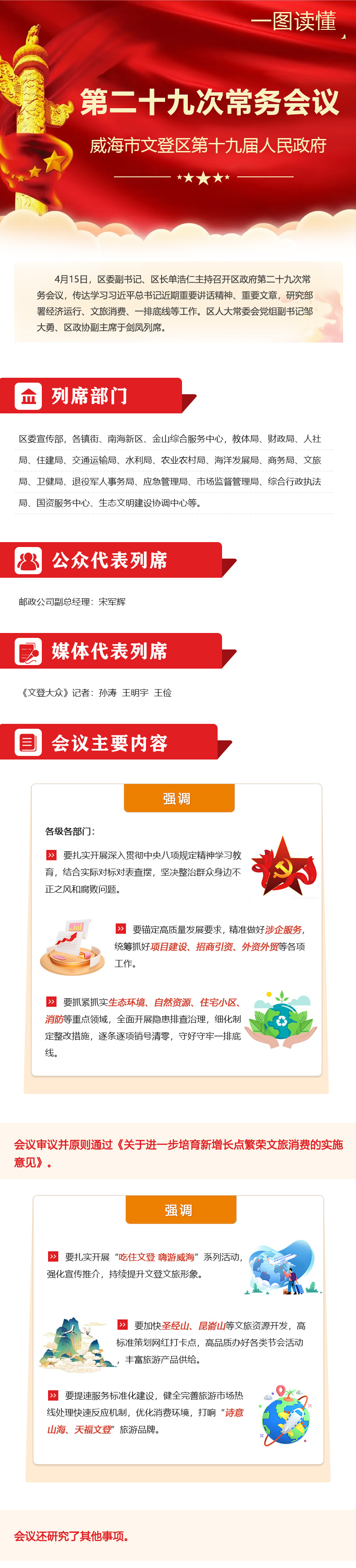 会议审议并原则通过《关于进一步培育新增长点繁荣文旅消费的实施意见》,强调,要扎实开展“吃住文登 嗨游威海”系列活动,强化宣传推介,持续提升文登文旅形象。要加快圣经山、昆嵛山等文旅资源开发,高标准策划网红打卡点,高品质办好各类节会活动,丰富旅游产品供给。要提速服务标准化建设,健全完善旅游市场热线处理快速反应机制,优化消费环境,打响“诗意山海、天福文登”旅游品牌。